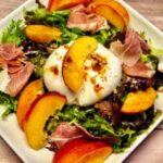 Mixed Green Salad with Peaches, Burrata Cheese and Proscuitto