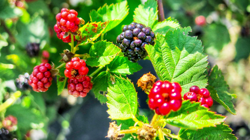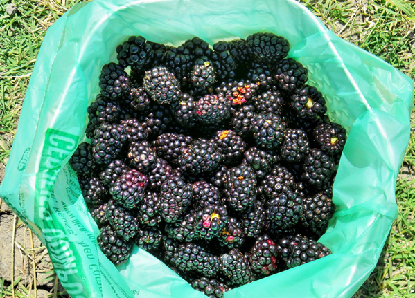 I quickly learned how to pick blackberries.  On my first trip, I picked the full black colored berries. These were usually on the outside of the vines, but I noticed they were smaller in size.  On my second trip, I dug deep.  In the middle of the vines are the full colored, plump, and sweet blackberries. It takes a little more effort to get these and at times your hands and arms can get scratched from the thorns. But oh, the difference in taste is well worth the effort.